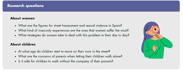 The main insight from the research was that sexual harassment is a major reason why women feel unsafe in public spaces. Unfortunately, it is a frequent issue in many women’s lives, leading some to normalise these experiences. Regarding children, Spain can be considered a relatively safe country where parents may confidently allow their children to walk to school alone, provided the children have been properly trained to do so.